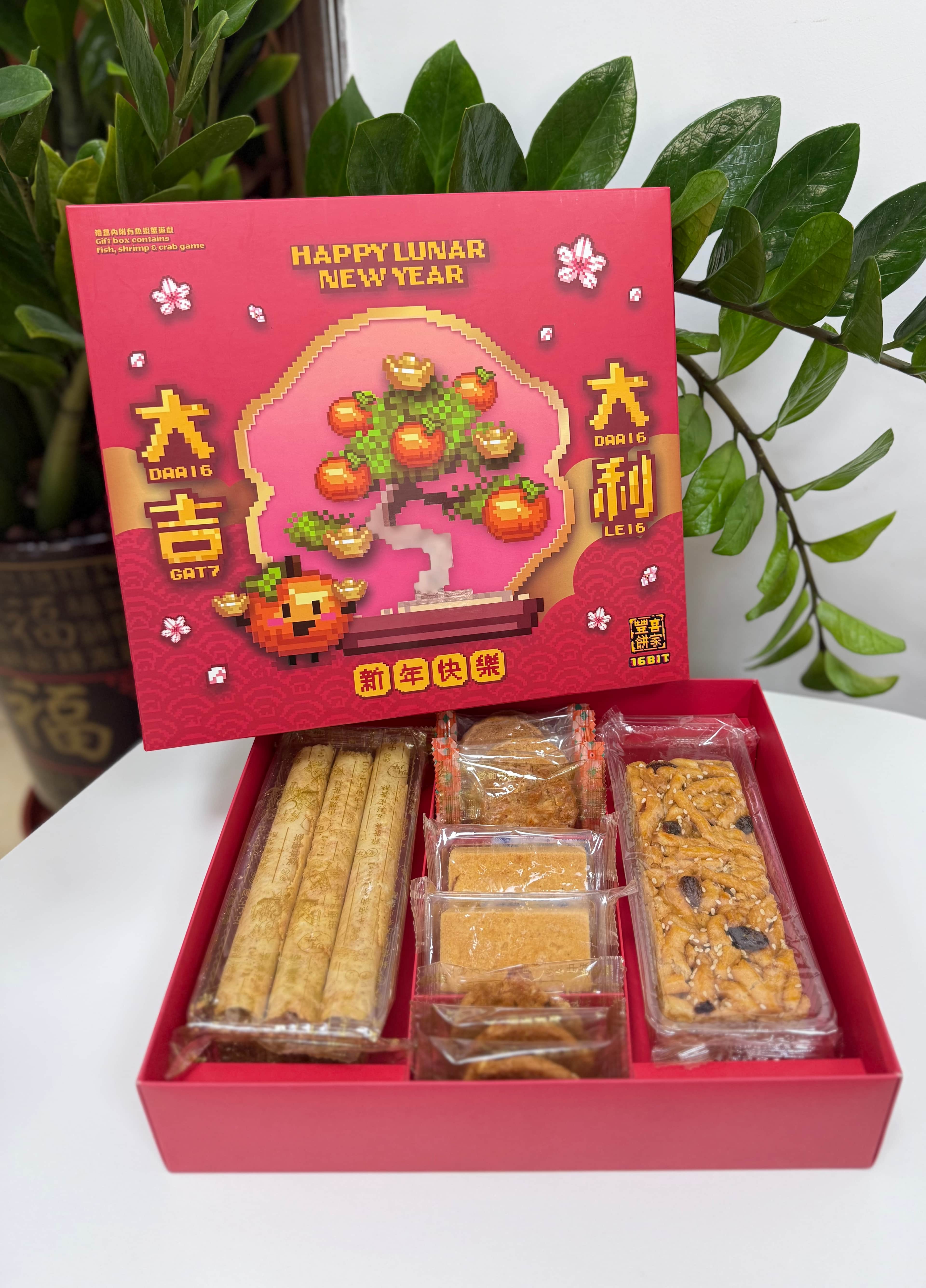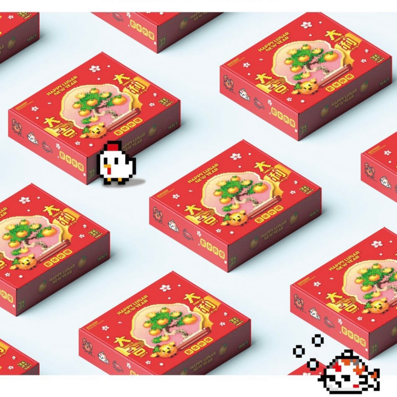 新春禮盒採用了折疊式天地蓋盒,利用摺紙作為間隔,整體實現無膠化環保包裝。趣緻的像素風設計,局部做了UV處理,突出品牌標誌,營造出多層質感與細節的把控。在提供食品本身的同時,也附上了遊戲‘魚蝦蟹’的遊戲配件從而增添品牌趣味性,送禮之餘還能和親戚朋友一起邊享用餅乾邊玩遊戲。